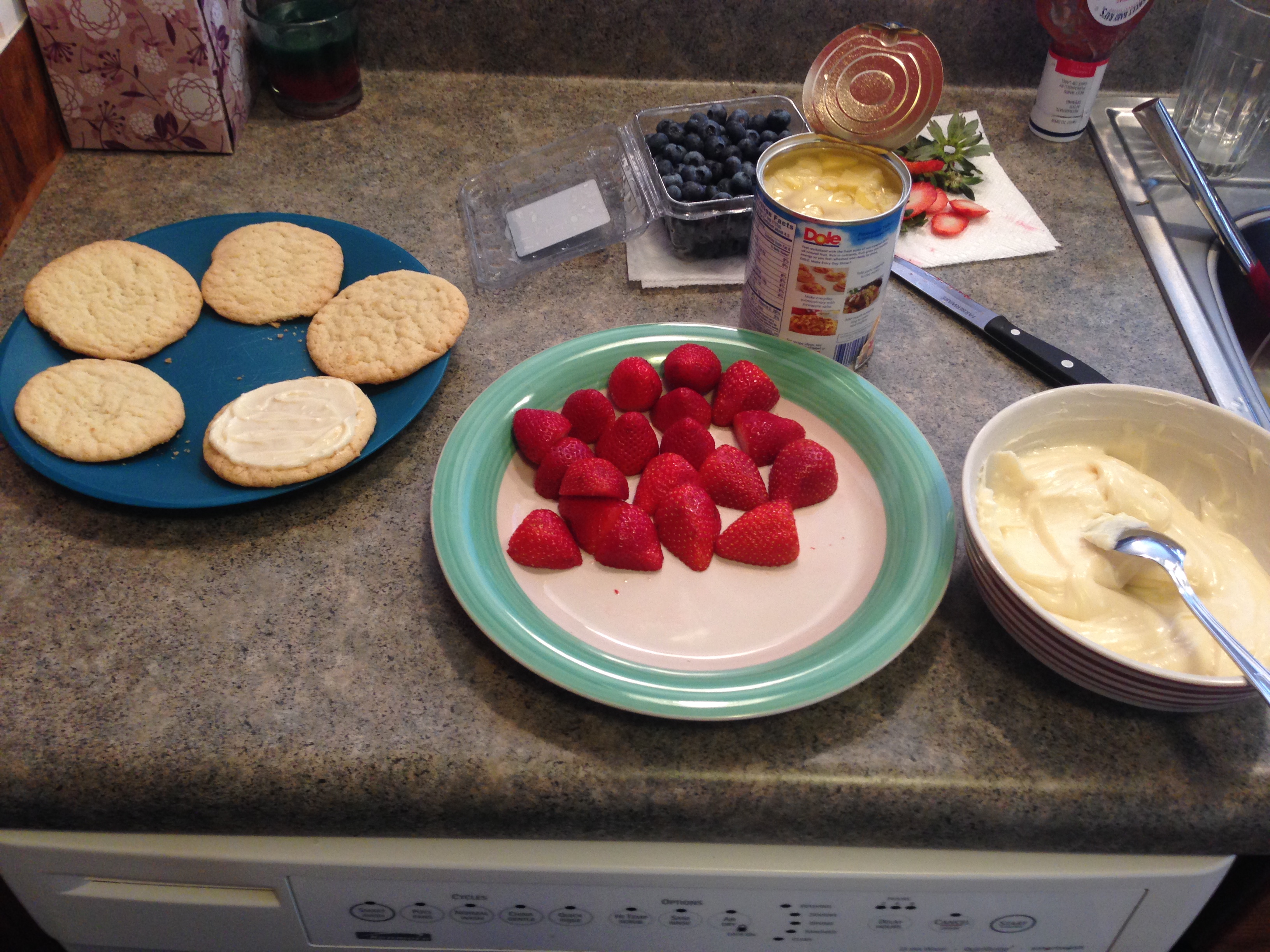 After the cookies have cooled, assemble your fruit pizzas.