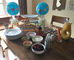 created some “hot air balloons” using mason jars, paper straws, yarn, and paper lanterns. All in all, these decorations were really reasonable and fairly easy to put together. I even set the extra straws out – another way to theme the event.
